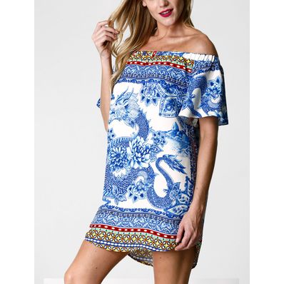 Vestido Farm Ombro a Ombro Dragão Ming Azul e Off White - M