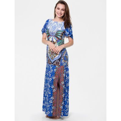 VESTIDO FARM LONGO BORBOLETÁRIO AZUL E OFF WHITE - G
