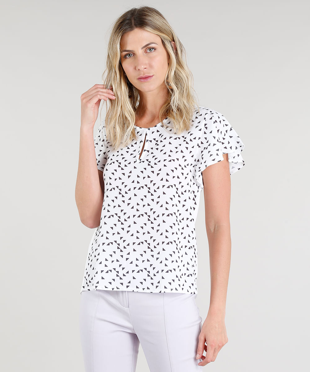 Blusa Feminina com Estampa Geométrica e Babado Manga Curta Decote Redondo